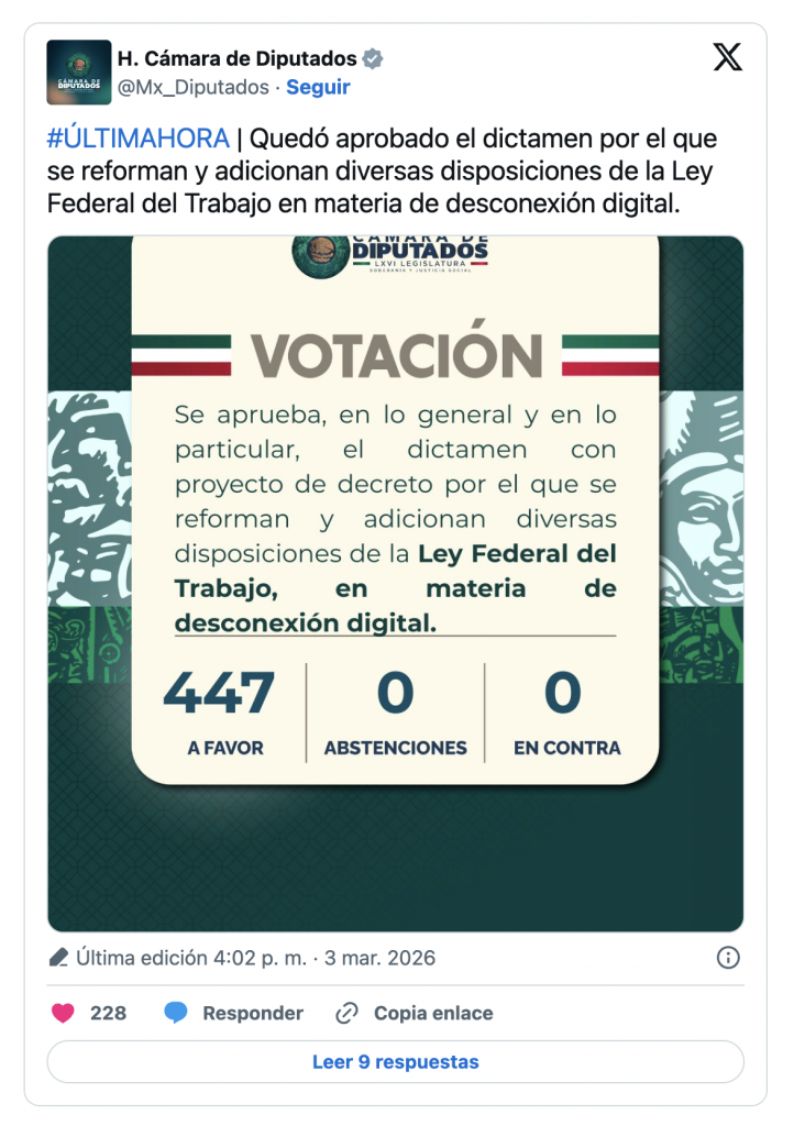 La Cámara de Diputados de México aprobó por unanimidad la reforma a la Ley Federal del Trabajo, que reconoce el derecho a la desconexión digital para las personas trabajadoras y establece nuevas obligaciones para los empleadores, como el pago correspondiente de horas extra por labores fuera del horario convenido.